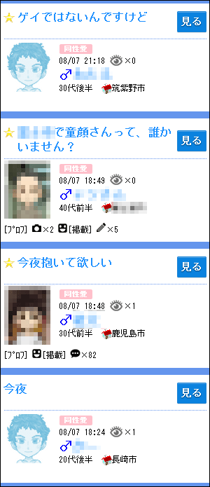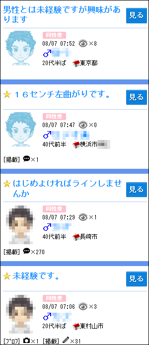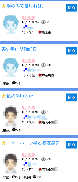 ハッピーメールに無料登録後、「掲示板検索」へ進み、性別を「♂男性 」(男性を探す)に変更してから、掲示板のジャンルの「同性愛」を選択して検索すると、下記のようなゲイ男性の書き込みが沢山リストアップされます。