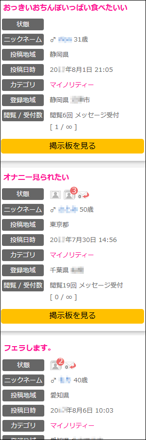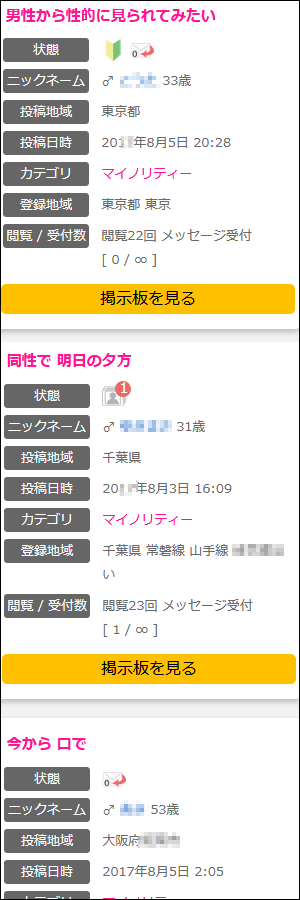 PCMAXに無料登録後、「掲示板検索」へ進み、「マイノリティ」カテゴリを選択して性別を「男性」を選択(マイノリティ趣向の男性を探す)して検索すると下記のようなゲイ男性の書き込みが沢山リストアップされます。