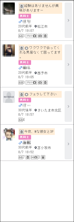 ワクワクメールに無料登録後、「掲示板検索」へ進み、性別を「男性♂から探す 」に変更してから、掲示板のジャンルの「男同士」を選択して検索すると、下記のようなゲイ男性の書き込みが沢山リストアップされます。